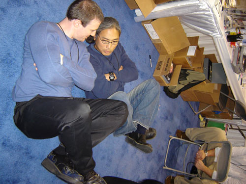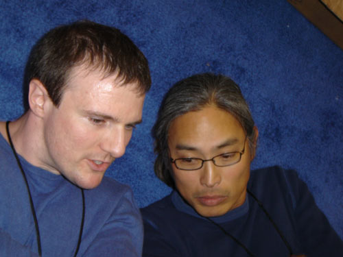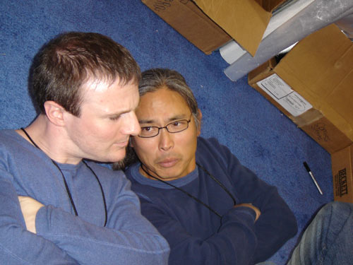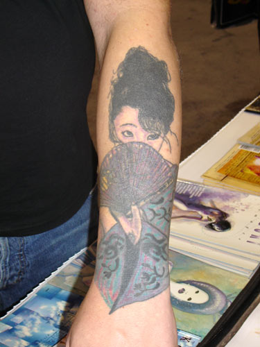 Below are images of a work-in-progress Kabuki fan tattoo (1) as well as David Mack participating in an interview for an upcoming documentary (2-4) and hanging out with Beckett Comics writer and artist Jeff Amano (5-7).