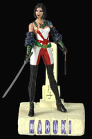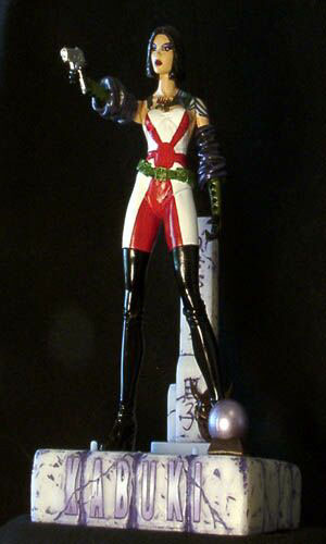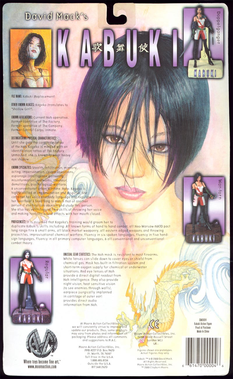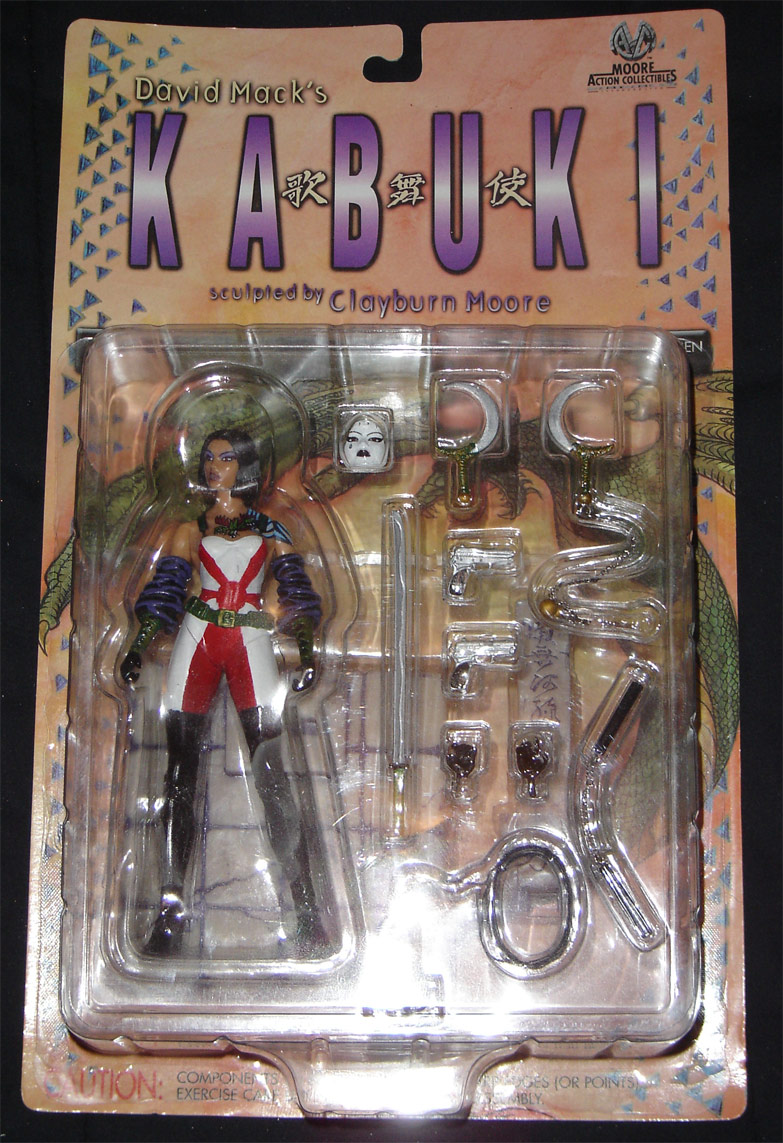 A Previews Exclusive! Sculpted by Clayburn Moore! This figure features a new head sculpt without the mask, and features a new outfit along with a very detailed tattoo. It depicts the doppelganger Kabuki from David Mack's critically acclaimed Image Comics series! Blister card packaging.