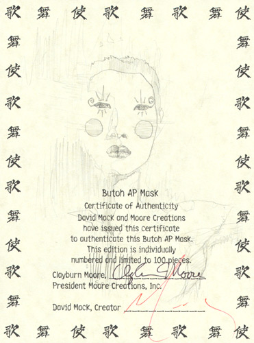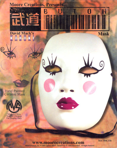 · On March 1, 2002, Moore Creations issued the following press release: "Moore Creations, Inc. is pleased to present the eighth, and final, mask to the already existing line of NOH Assassin masks based on David Mack's Kabuki comic. The Butoh Mask will finish out the collection out with a bang! If you've already begun collecting the series, you won't want to miss out on this final piece. Each individual mask in this collection is valuable, but together, they are priceless! With the previously released Kabuki and Siamese Twin Masks selling out, the remaining masks are available only in limited quantities. Be sure to get your Butoh Mask before, it too, is only a distant memory in the hearts and minds of those who missed out.